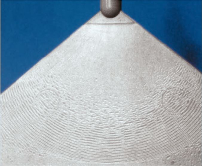 Tokové čáry (Flow Lines): Jemné rýhy a vlny v podobě kružnic na povrchu připomínající rýhy na gramofonové desce. Radiálně ve směru toku taveniny.Vzniká střídavou stagnací a poskočením čela taveniny při nedostatečném tlaku a rychlosti na čele toku. Hmota není neustále v plném kontaktu s povrchem formy, ale navalí se nad povrch a na chvilku se zastaví a pak poskočí. Zamrzlá vrstva se tak tvoří přerušovaně Pulzace jsou způsobené nízkou teplotou formy nebo nízkou teplotou taveniny případně pomalou rychlostí plnění. Dalo by se říct, že když je rychlost plnění vysoká, roste riziko Blušení (7) a Jettingu,(8) když je moc malá vzniká hezitace, tokové čáry, Gramofon grooves . Čáry blízko EOF( End Of Fll - konce tečení) jsou díky moc brzy stanovenému bodu přepnutí. Plnění dotlakem je o řád(y) pomalejší a mechanismus je stejný.