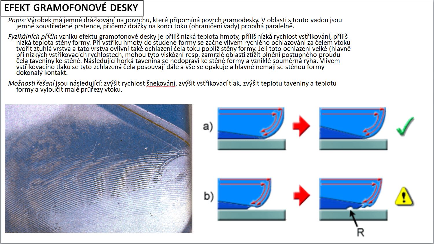 L.Zeman: zvýšit teplotu taveniny (zejména na trysce),zvýšit teplotu formy,zvýšit rychlost vstřikování, zkontrolovat bod přepnutí (95-98% naplnění v první fázi), kontrola temperačního systému, převtokovat. Gramofon: zvýšit teplotu formy, zvýšit rychlost vstřikování, zvětšit zpětný tlak a otáčky, přezkoušet materiál, vlhkost.