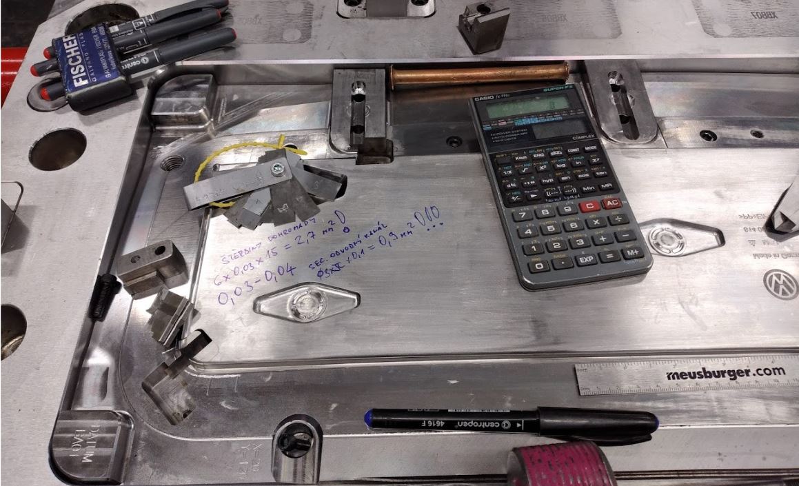 Další problém je, že se neomačkávají jenom odvzdušňovací drážky, ale i hrany dělící roviny ,To způsobuje" škrábání " výlisku , vadu, které kvalitáři říkají " čárový kód" . Nástrojař pak musí začistit namačkaný otřep v dělící rovině .