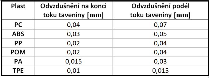 Tabulka ukazuje kolik vzduchu dokáže odejít z formy standartními vyhazovači pr. 1,2 až 8 mm.