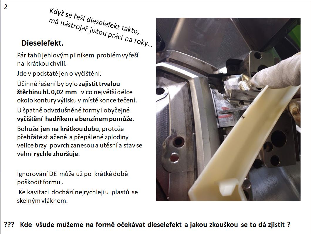 Při vyšší teplotě klesne viskozita, hmota skokově zrychlí, vzduch už vůbec nebude stíhat a přehřeje se mnohem víc, až vznikne spálenina ,dieselefekt, eroduje povrch formy a dělící rovinu. (kavitace a zástřiky) Další efekt je, že horké stlačené plyny a zplodiny pálení se tlačí do dělící roviny do přicpané štěrbiny. Po průchodu štěrbinou ztratí rychlost, ztrácí tlak, je horký a chladne… (trojný bod nefunguje jenom na hranici mraků) kondenzuje a postupně štěrbinu dotěsní a celý proces nabírá na dynamice a urychluje se a končí jasným těžkým dieselefektem s erozí . V tomto stádiu pak postupuje poškození formy velice rychle. Říká se tomu exponenciála… furt nic a pohoda, pomalu narůstá, pak zrychlí a strmě vystřelí…