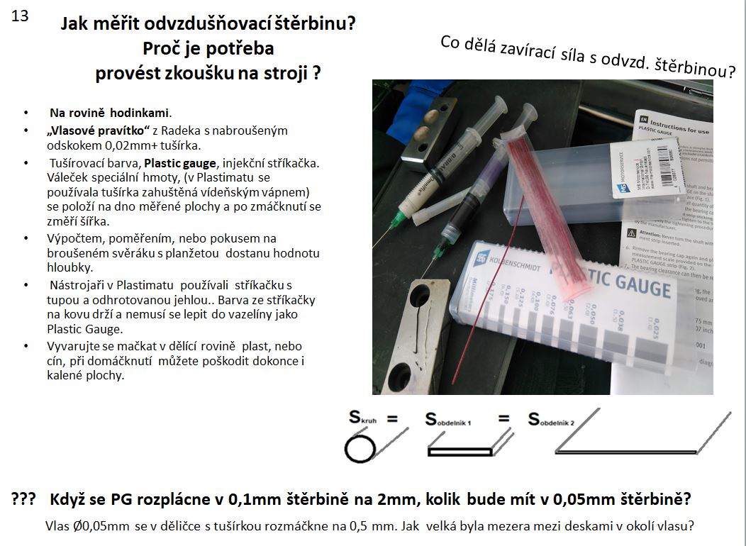 13, Jsou různé způsoby měření a doměřování ve formařině : speciální modelína, Plastic gauge, tušírovací barva, planžety, sklářské jehly, klínky, brinelova lupa..