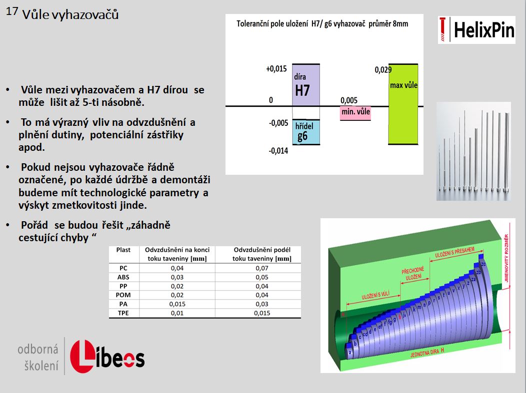 16, Standartní velmi účinný způsob odvzdušnění, který by se ale měl uplatnit ještě ve fázi, kdy formu vymýšlí a ladí konstruktér je použití vyhazovačů v místě uzavírání vzduchu.