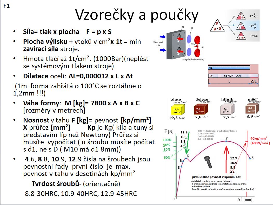 Tuhle jednoduchou dílenskou poučku oceníte, když budete chtít zkontrolovat správnou zavírací sílu stroje, nebo budete špekulovat ,proč se forma při vstřiku otvírá, dýchne, prohne, nebo proč vám při vstřiku, nebo dotlaku couvají čelisti.