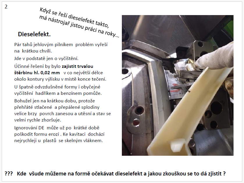 Při vyšší teplotě klesne viskozita, hmota skokově zrychlí, vzduch už vůbec nebude stíhat a přehřeje se mnohem víc, až vznikne spálenina ,dieselefekt, eroduje povrch formy a dělící rovinu. (kavitace a zástřiky) Další efekt je, že horké stlačené plyny a splodiny pálení se tlačí do dělící roviny do přicpané štěrbiny. Po průchodu štěrbinou ztratí rychlost, ztrácí tlak, je horký a chladne… (trojný bod nefunguje jenon na hranici mraků) kondenzuje a postupně štěrbinu dotěsní a celý proces nabírá na dynamice a urychluje se a končí jasným těžkým dieselefektem s erozí . V tomto stádiu pak postupuje poškození formy velice rychle. Říká se tomu exponenciála… furt nic a pohoda, pomalu narůstá, pak zrychlí a strmě vystřelí…