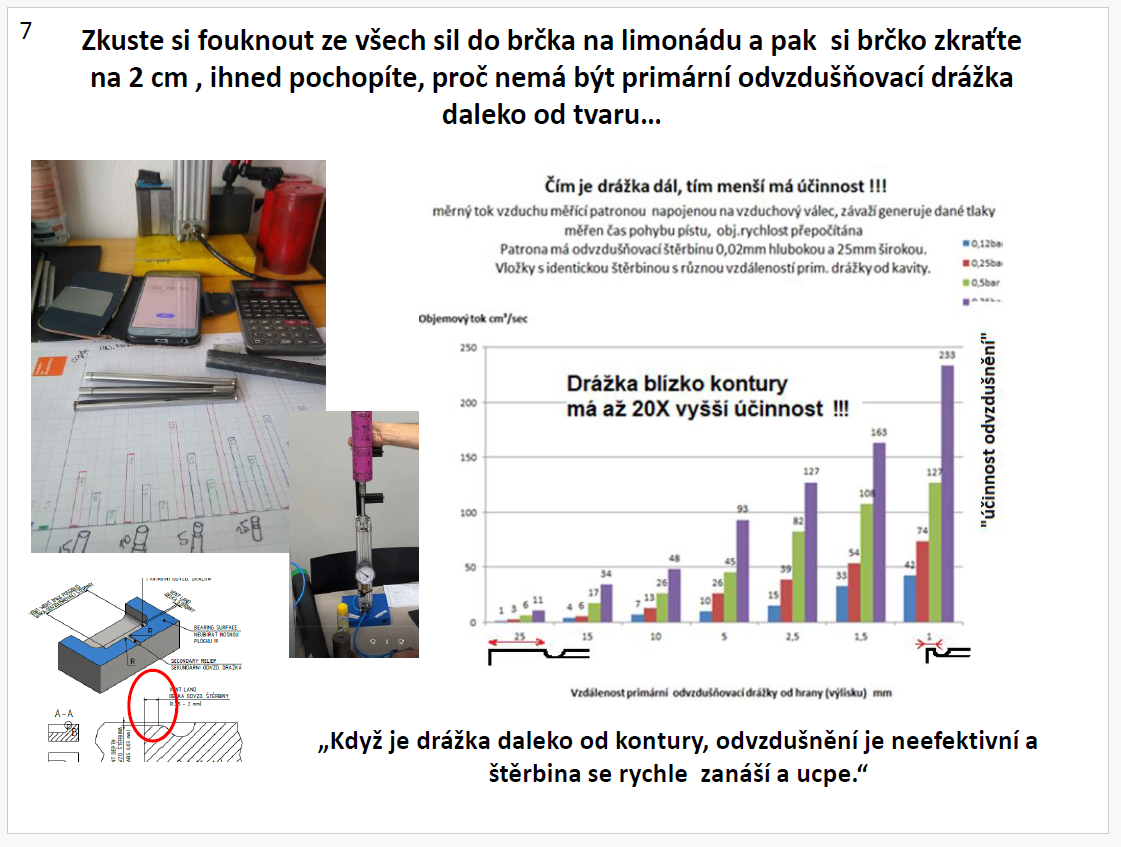 Tohle je docela důležitý pochopit : Zkuste si fouknout ze všech sil do brčka na limonádu a pak si brčko zkraťte na 2 cm , ihned pochopíte, proč nemá být primární odvzdušňovací drážka daleko od tvaru…