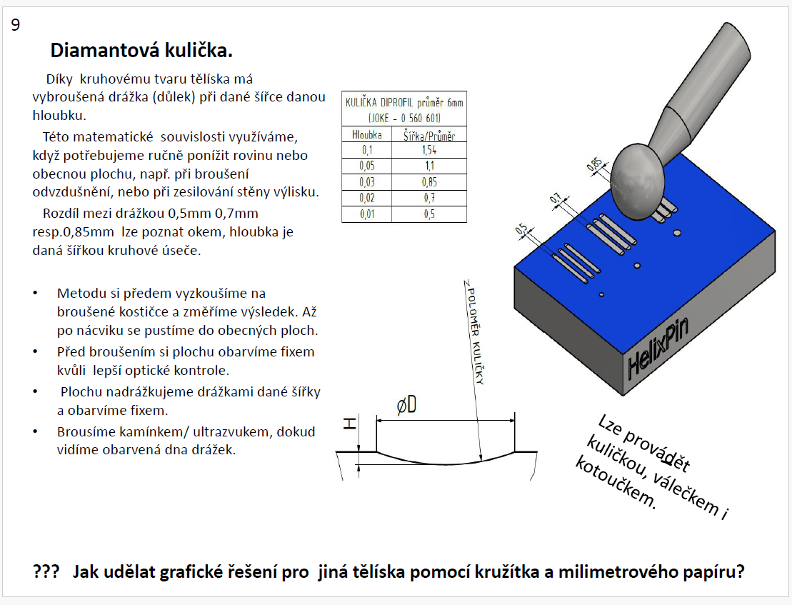 Na tomto slidu je popsaná jedna z metod, jak nástrojař vybrousí pomocí ručního nářadí do obecného tvaru ponížení s přesností na setinu mm. Pochopitelně, pokud je možné provést obrobení strojně, jiskření cnc, magnetka, pak samozřejmě provedeme, nebo necháme udělat na stroji.
