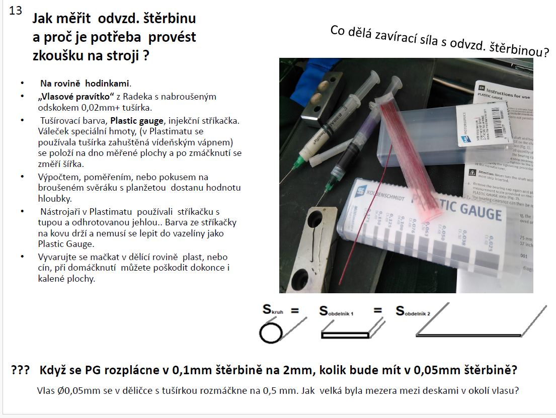Jsou různé způsoby měření a doměřování ve formařině : speciální modelína, Plastic gauge, tušírovací barva, planžety, sklářské jehly, klínky, brinelova lupa..