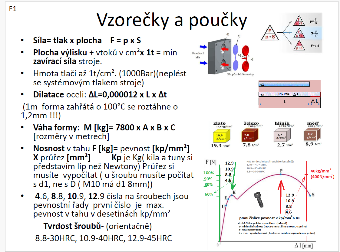 Tuhle jednoduchou dílenskou poučku oceníte, když budete chtít zkontrolovat správnou zavírací sílu stroje, nebo budete špekulovat ,proč se forma při vstřiku otvírá, dýchne, prohne, nebo proč vám při vstřiku, nebo dotlaku couvají čelisti.